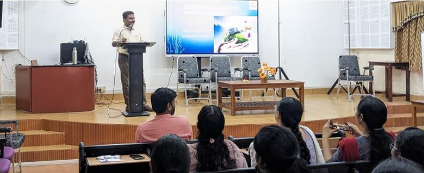 Solar energy, harnessed from the sun, was discussed as a powerful and abundant source of clean energy. Dr. Solomon explained the technological advancements in solar panels and their increasing efficiency. Wind energy, derived from the movement of air, was presented as another promising renewable source, with innovations in wind turbine design enhancing its viability. Hydro energy, generated from water, was highlighted for its reliability and capacity for large-scale power generation. Geothermal energy, sourced from the heat within the earth, was noted for its potential in providing consistent and sustainable energy. Biomass energy, produced from organic materials, was discussed for its versatility and role in waste management. Dr. Solomon also emphasized the need for innovative solutions in energy storage and efficiency to overcome the intermittent nature of some renewable sources. He discussed emerging technologies, policy frameworks, and career opportunities in the renewable energy sector, encouraging students to actively engage with these topics. In addition to the technical aspects, Dr. Solomon introduced students to the idea incubation centers at the University of Kerala, which support innovation and entrepreneurship in renewable energy and sustainability.